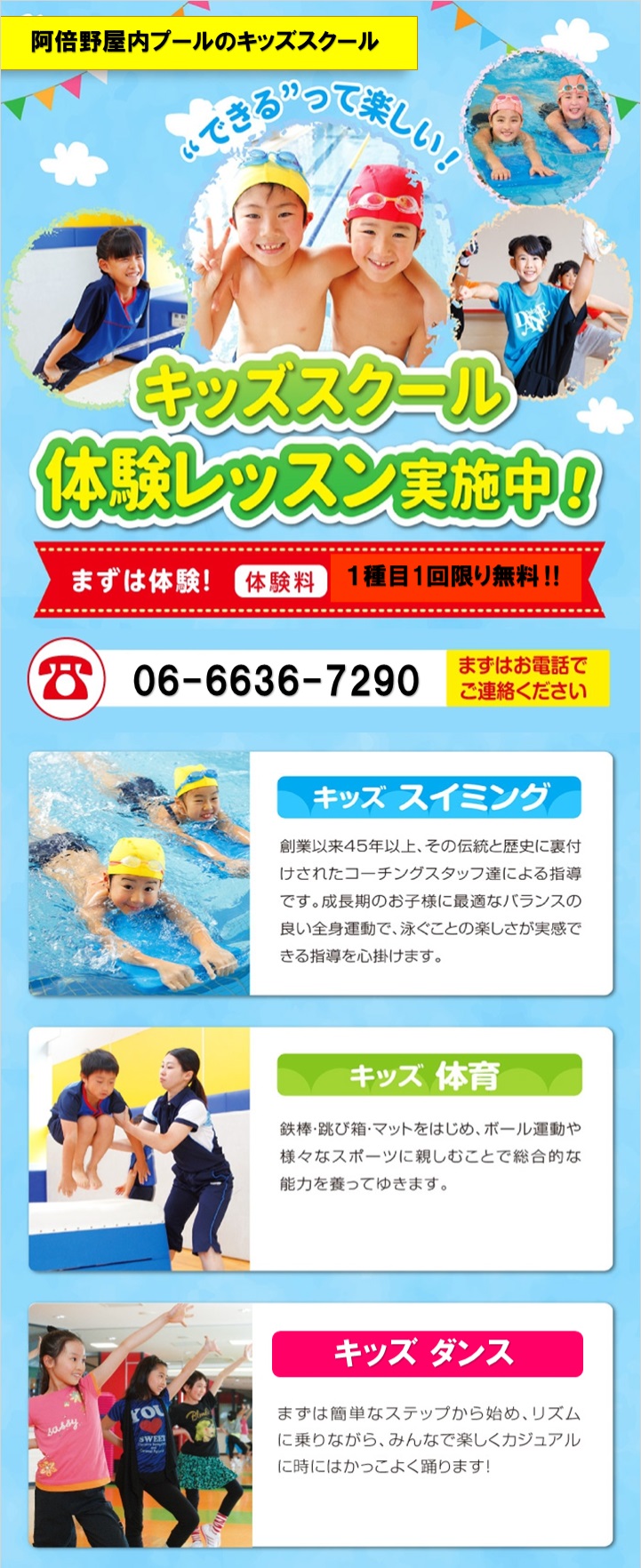 水泳・体育・ダンスの3種目を1回無料でご体験いただけます! お子様の成長を促す人気の3種目です。 お申し込みはお電話で受け付けております。