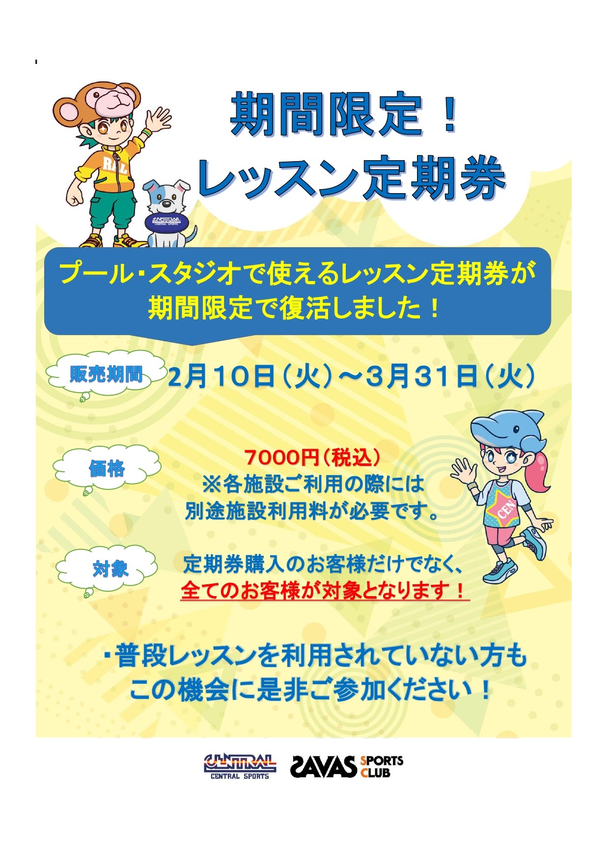 スタジオ、プールレッスン受け放題!!レッスン定期期間限定発売 2026/02/01 色々なレッスンを1枚の定期券で参加可能になります。 ※別途施設利用が必要です。 販売期間:2026年2月10日~2026年3月31日迄 販売料金:7,000円(税込) 購入方法は1階総合受付の券売機にて購入後、所定の申込用紙記入で購入日から 使用可能