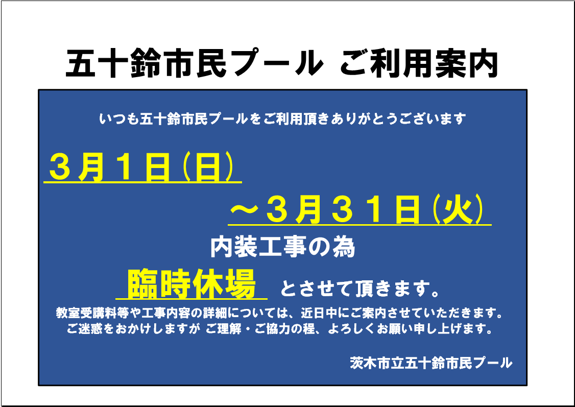 2026年01月15日重要なお知らせ 2026年3月 内装工事にかかる施設の休場について 教室受講料等や工事内容の詳細については、近日中にご案内させていただきます。 ご迷惑をおかけいたしますが、ご理解・ご協力の程、よろしくお願い申し上げます。 施設TOPへ戻る