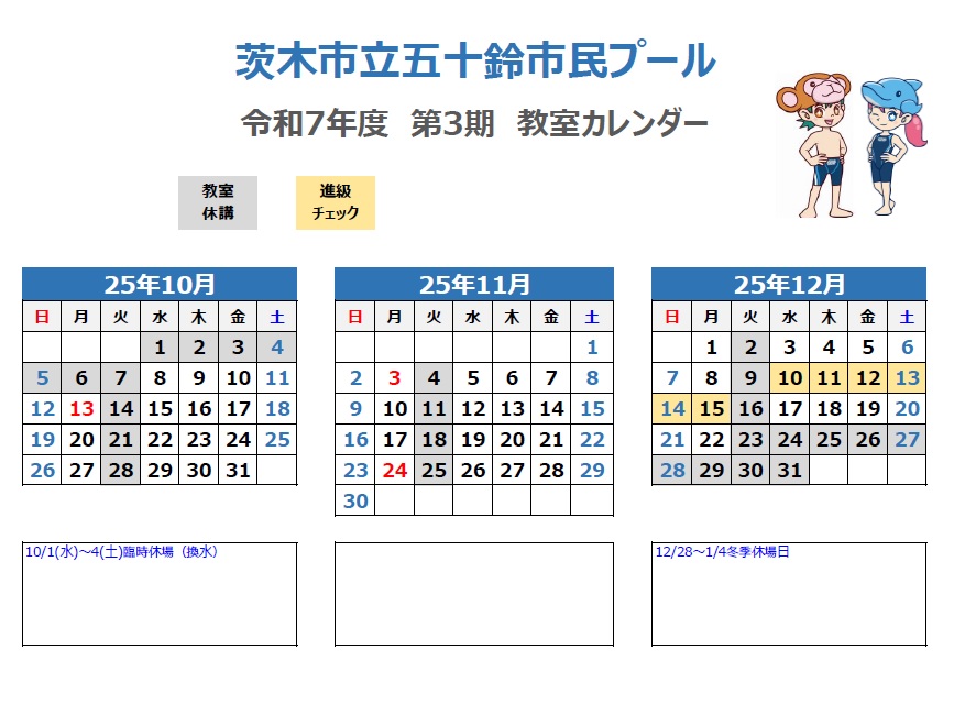 2025年09月10日教室からのお知らせ 第3期教室カレンダー 令和7年度 第3期(10月~12月)の教室スケジュールです ※大人教室は、オレンジ枠も通常通り実施します。※進級チェックは、子供水泳教室が対象です。※フィットネス教室も同日程で実施します。 お知らせ一覧