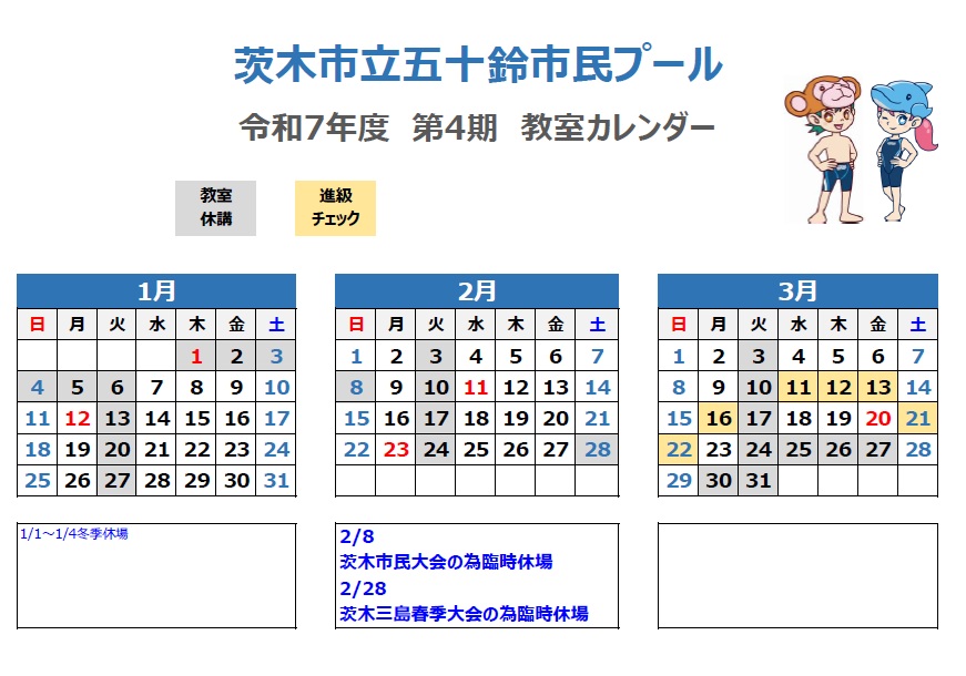 2025年12月01日教室からのお知らせ 第4期教室カレンダー ※大人教室は、オレンジ枠も通常通り実施します。※進級チェックは、子供水泳教室が対象です。※フィットネス教室も同日程で実施します。 お知らせ一覧
