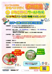 日 程 2026年5月17日(日) 行 先 Berry Parkいずみの ワールド牧場 対 象 5歳~中学生 参加費 幼児・小学生 18,500円(税込) 中学生 19,000円(税込)