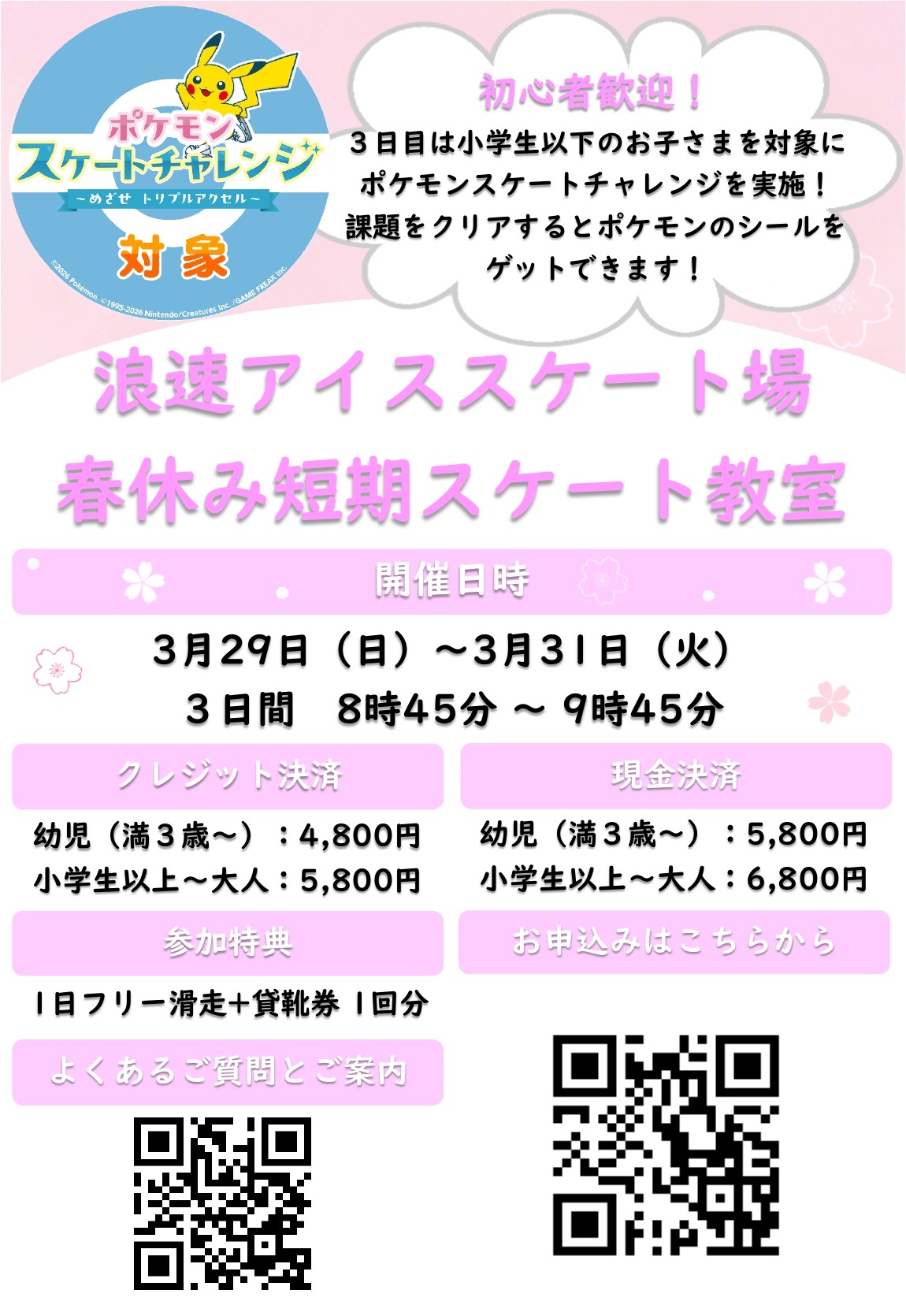【アイススケート】2026年春休み短期教室のお知らせ【3月29日 ~ 31日】 2026/02/24 3月27日(金)18時まで予約受付中!セントラルスポーツプラザ 浪速アイススケート場春休み短期スケート教室 3日間開催日時:3月29日(日)~3月31日(火)3日間 8時45分 ~ 9時45分まで小学生以上料金:5,800円(クレジット決済)/ 6,800円(現金決済) 幼児料金:4,800円(クレジット決済)/ 5,800円(現金決済)対象:満3歳 ~ 大人小学生以上定員:150名 幼児 定員:35名 ※2月24日現在、キャンセル待ちとなっております。 参加特典:1日滑走・貸靴無料券1回分プレゼント!よくあるご質問・ご利用案内はこちら☞ 予約申込: ※ネット予約を利用される際には、利用規約を必ずご確認ください電話予約:06-6643-6448※電話予約では現金決済のみの対応となります。 また、【当日までに事前来場ができる方】のみ受付いたします。 事前来場の際は【B1スケート場】までお越しください。 対応可能時間は、10時 ~ 18時までです。※指導員手配、当日の混雑回避等の為当日申込は受付できません。あらかじめご了承ください。