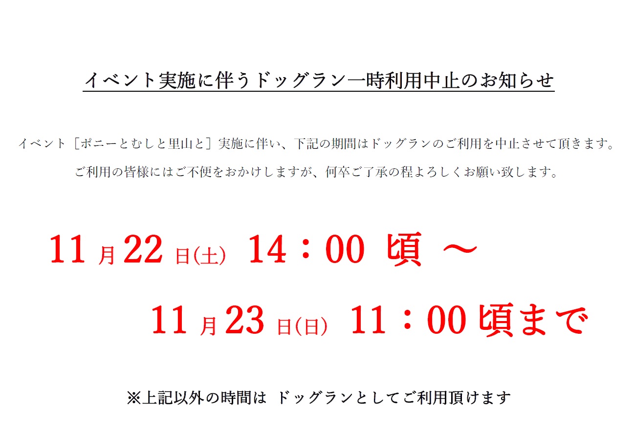 【ドッグラン】11/22(土)・11/23(日) 一時利用中止のお知らせ