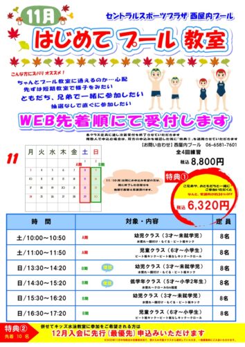 ご好評秋の9月水泳短期教室に引き続き、1ヶ月限定の11月水泳教室を実施いたします。
