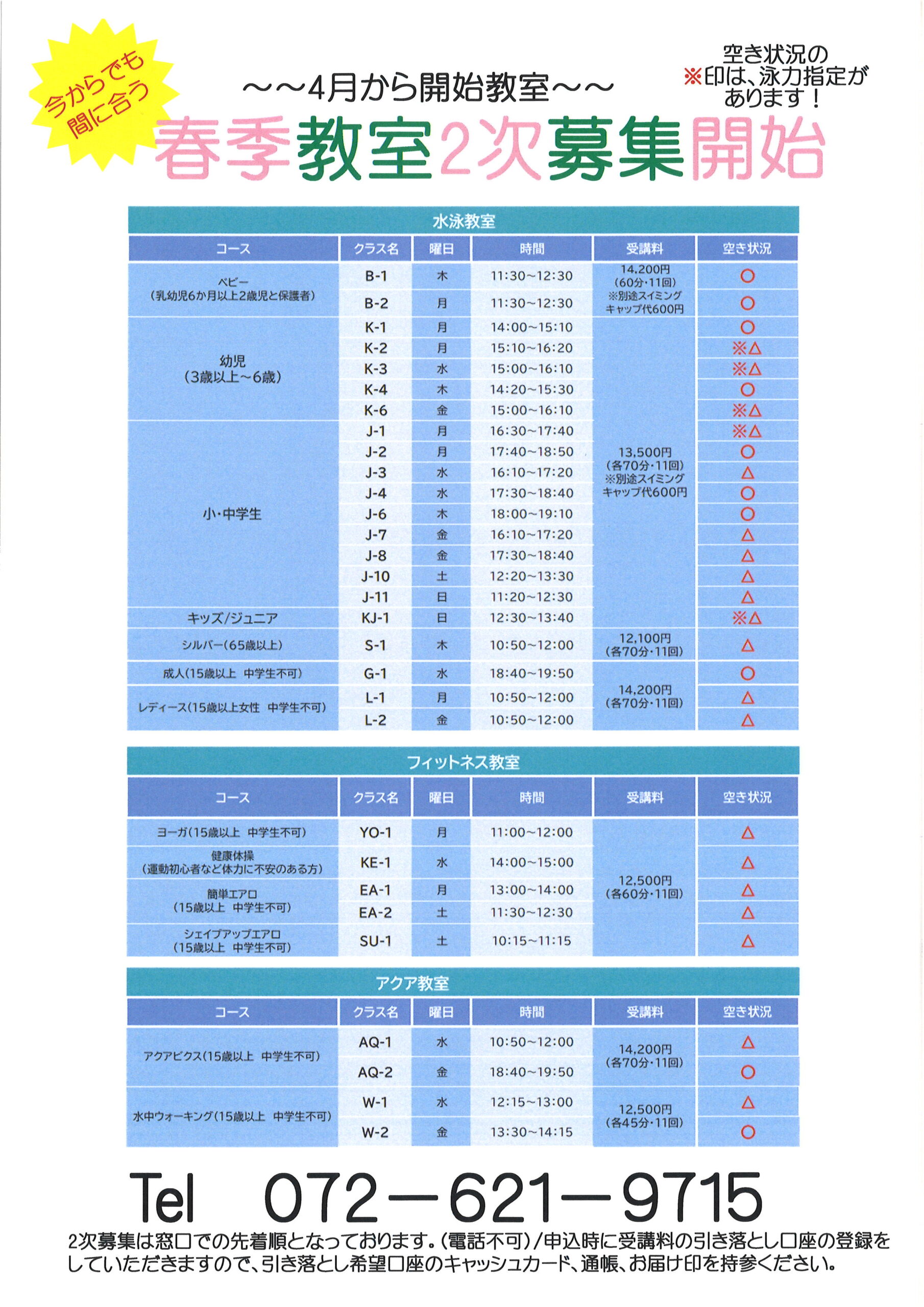 2026年03月20日重要なお知らせ 春季教室2次募集開始のお知らせ 3月20日現在の募集状況です。 2026年3月23日(月)より 春季教室の2次募集を開始します!・2次募集は受付にて先着順となります(電話では申込できません)・受講料引き落とし用口座のキャッシュカード、通帳、銀行印を持参ください・泳力指定のあるクラスにはお手数ですが、お電話にてお問い合わせください・最新情報はお電話にてお問い合わせください 施設TOPへ戻る