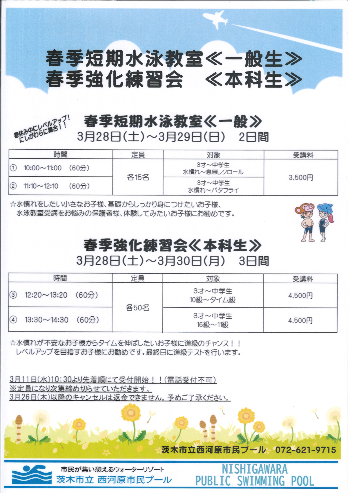 2026年03月02日教室からのお知らせ 大人気 2026年度春季短期水泳教室開催 3月11日(水)から春の短期教室の募集がはじまります!定員になり次第締め切りとなりますので、お急ぎください! お知らせ一覧