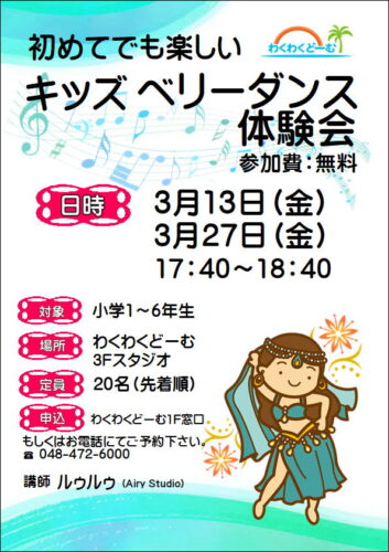 3/13・27 キッズベリーダンス無料体験会開催 2026/02/27 ○こどもスポーツ教室からお知らせ4月より新たにキッズベリーダンスの教室が開講します。はじめてでも楽しいベリーダンス3月は無料体験会を開催しますので、ご興味のある方はぜひご体験ください!!日時:2026年3月13日(金) 3月27日(金) 17:40~18:40対象:小学1~6年生定員:20名(先着順)申込:わくわくどーむ1F窓口、もしくはお電話にてご予約ください。