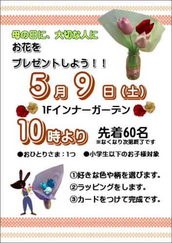 5/9(土) 大切な人にお花をプレゼントしよう! 2026/04/25 大切な人にお花をプレゼントしよう!!好きな色や柄の花を3つ選んでキレイにラッピング♪カードにメッセージを添えて完成です☆5月9日(土) 10時より先着60名※なくなり次第終了となります。開催場所:1Fインナーガーデン対象:小学生以下のお子様お一人様 ひとつでお願いしております。