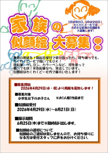 4/29(祝水)より家族の似顔絵大募集 2026/04/25 5月は母の日、6月は父の日!わくわくどーむでは「大好きな家族の似顔絵」を大募集します。似顔絵受付:2026年4月29日(祝水)~6月21日(日)展示期間:6月25日(木)※随時貼り出しいたします。対象: 小学生以下のお子様(3歳~12歳) おひとり様一作品まで似顔絵用の専用用紙を1F総合受付にてお渡ししています。お家に持ち帰っても、わくわくどーむで描いてもOK!色鉛筆、クレヨン、カラーペンなど何を使って描いてもOK!!※色鉛筆は貸出しています。似顔絵はわくわくどーむ内で展示いたします。